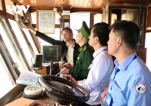 Cơ quan chức năng kiểm tra thiết bị giám sát hành trình trên tàu cá trước khi cho xuất bến |
