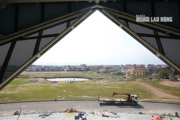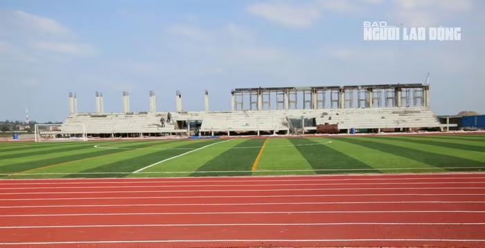 Mặt sân cỏ nhân tạo đã hoàn thành, khu vực khán đài VIP đang được thi công các hạng mục cuối. |