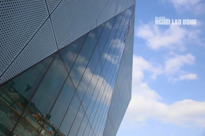Toàn bộ mặt kính phẳng đứng phản chiếu bầu trời xanh, kết hợp cùng các tấm nhôm đục lỗ thông gió ghép lại ở các góc cạnh, vừa đảm bảo thẩm mỹ vừa tăng hiệu quả sử dụng năng lượng. |