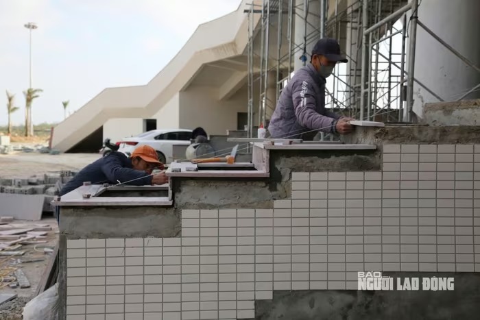 Bên ngoài nhà thi đấu, công nhân đang thi công ốp đá các bậc cầu thang dẫn vào và hoàn thiện cảnh quan xung quanh. Khuôn viên quanh nhà thi đấu được lát đá tự nhiên, trồng cây xanh đồng bộ. |