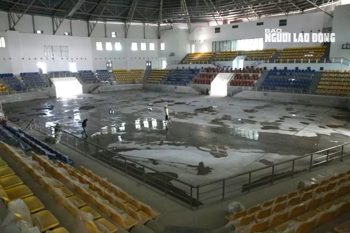 Bên trong nhà thi đấu đa năng, hệ thống khán đài 2.500 chỗ ngồi đã cơ bản hoàn thiện, công nhân đang dọn dẹp, vệ sinh trước ngày bàn giao. |