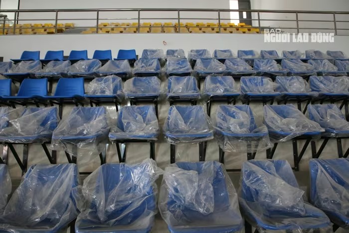 Các dãy ghế khán giả đã lắp đặt hoàn chỉnh, chờ ngày bàn giao công trình và ghế khán đài được bọc nilon để tránh bụi trong giai đoạn hoàn thiện. |