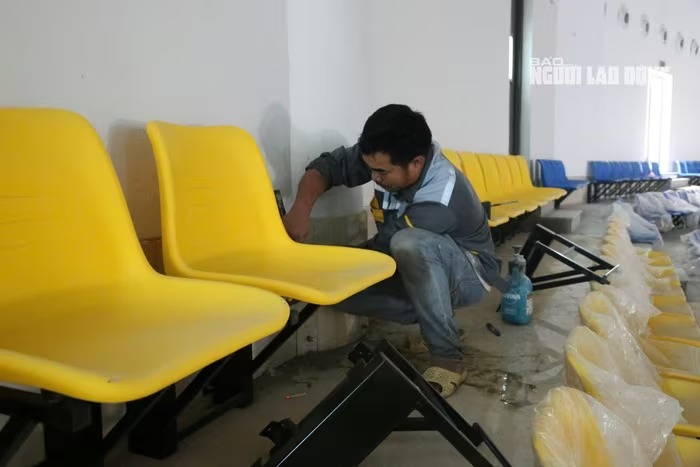 Theo anh Võ Tấn Hiếu, đại diện đơn vị thi công, toàn bộ ghế khán giả đã được lắp đặt xong, hiện chỉ còn hoàn thiện khu vực bàn ghế VIP. Các dãy ghế sau khi lắp vẫn được bọc túi nilon để tránh bụi bẩn trong quá trình hoàn thiện công trình. |
