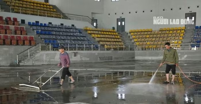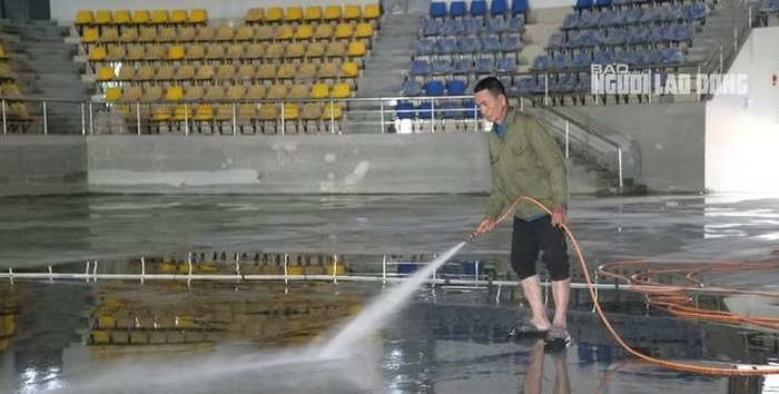 Mặt sân thi đấu đa năng đang được vệ sinh, hoàn thiện trước khi nghiệm thu. |