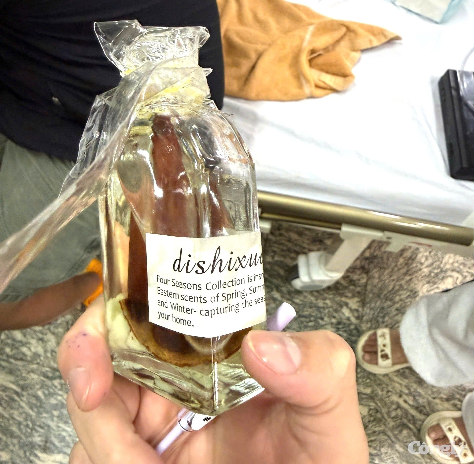 Chai dầu thơm được gia đình mang đến bệnh viện khi cháu bé 3 tuổi nuốt phải nhập viện. |