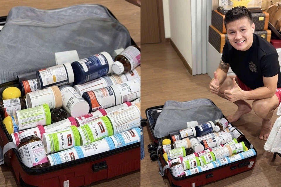 Ngày 8/11, Chu Thanh Huyền, vợ cầu thủ Nguyễn Quang Hải, đăng bức ảnh chồng ngồi bên chiếc vali đựng đầy đồ sau chuyến đi nước ngoài, kèm theo dòng chú thích: "Như thông lệ sau mỗi lần ổng đi công tác, và lần này đi Australia 1 tuần về 1 vali TPCN (thực phẩm chức năng - PV) cho đại gia đình".