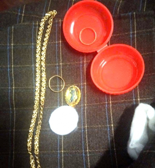 Qua kiểm tra, trong hộp trang sức này có 2 nhẫn tròn kim loại màu vàng, 1 dây chuyền vàng và 1 mặt tượng đá bọc kim loại màu vàng.