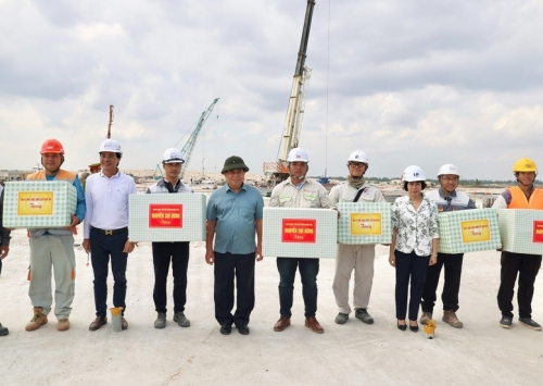 Phó Thủ tướng Nguyễn Chí Dũng tặng quà cho người lao động đang thi công tại Khu bến cảng Mỹ Thủy - Ảnh: VGP/Thu Sa |
