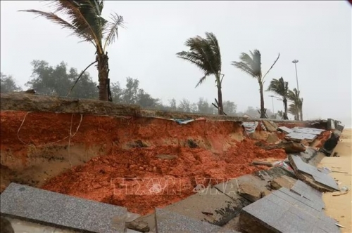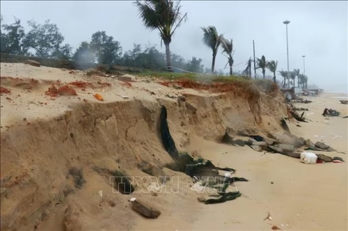 Các đợt mưa bão khiến tình trạng sạt lở ở bãi tắm cộng đồng Trung Giang diễn biến phức tạp. |