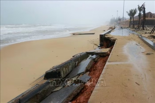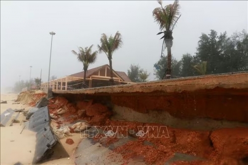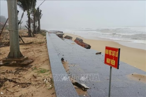 Khoảng 120m chiều dài bờ kè bãi tắm cộng đồng Trung Giang thuộc xã Bến Hải, tỉnh Quảng Trị bị sạt lở, hư hỏng nặng. |