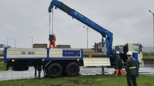 Công ty Điện lực Quảng Trị huy động phương tiện và công nhân vận chuyển cột điện để thay thế. |