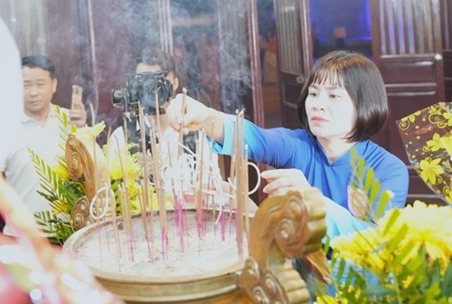 Giám đốc Sở Y tế Quảng Trị Diệp Thị Minh Quyết dâng hương tri ân các Anh hùng liệt sĩ tại Bến thả hoa bờ nam sông Thạch Hãn. |