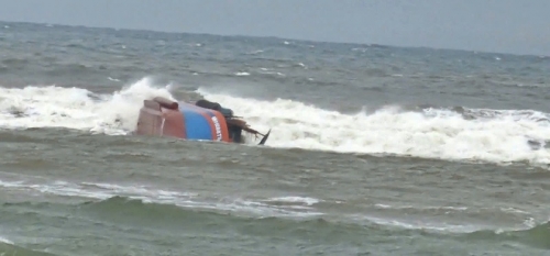 Tàu cá bị lật tại biển Nhật Lệ. Ảnh: Hoài Nam |