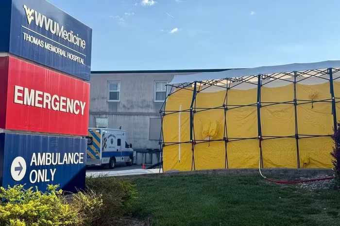 Một lều khử độc được dựng lên bên ngoài Bệnh viện Thomas Memorial thuộc WVU Medicine tại South Charleston, Tây Virginia, ngày 22/4/2026. Ảnh: AP/John Raby. |