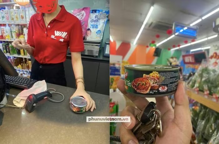 Nhân viên của hàng WinMart và đồ hộp "Bò Bít Tết" có logo của Đồ hộp Hạ Long. Ảnh: Phước Nguyên |
