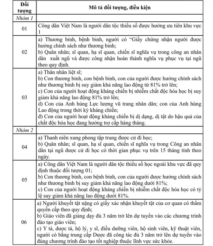 Mức điểm ưu tiên áp dụng cho nhóm đối tượng UT1 (gồm các đối tượng 01 đến 03) là 2,00 điểm và cho nhóm đối tượng UT2 (gồm các đối tượng 04 đến 06) là 1,00 điểm.