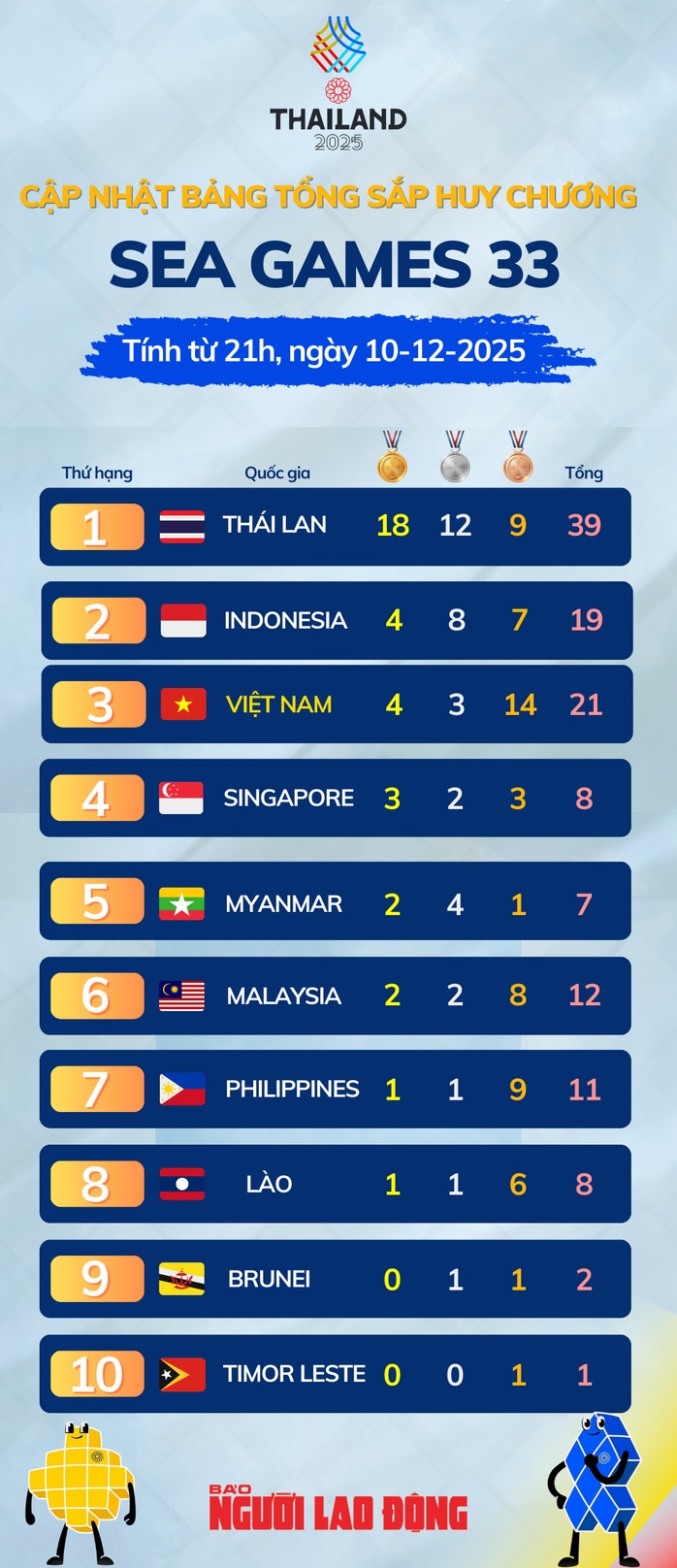 | "Tính đến 19 giờ 30 phút ngày 10-12, đoàn Việt Nam đã có được 4 HCV. |