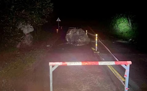 Một tảng đá nặng hàng tấn bất ngờ lăn từ vách núi xuống đường Hồ Chí Minh nhánh Tây, đoạn qua xã Trường Sơn, tỉnh Quảng Trị trong đêm qua.