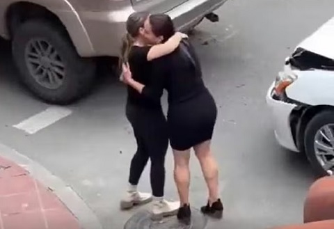 Sau va chạm, cả hai người phụ nữ đều ra khỏi xe, kiểm tra thiệt hại và trò chuyện thân thiện, khiến người qua đường ngạc nhiên.