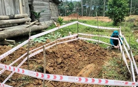 Trong quá trình đào đất làm móng nhà, một hộ dân ở xã Tuyên Lâm (tỉnh Quảng Trị) phát hiện một quả bom nặng khoảng 340 kg, đang còn nguyên kíp nổ.