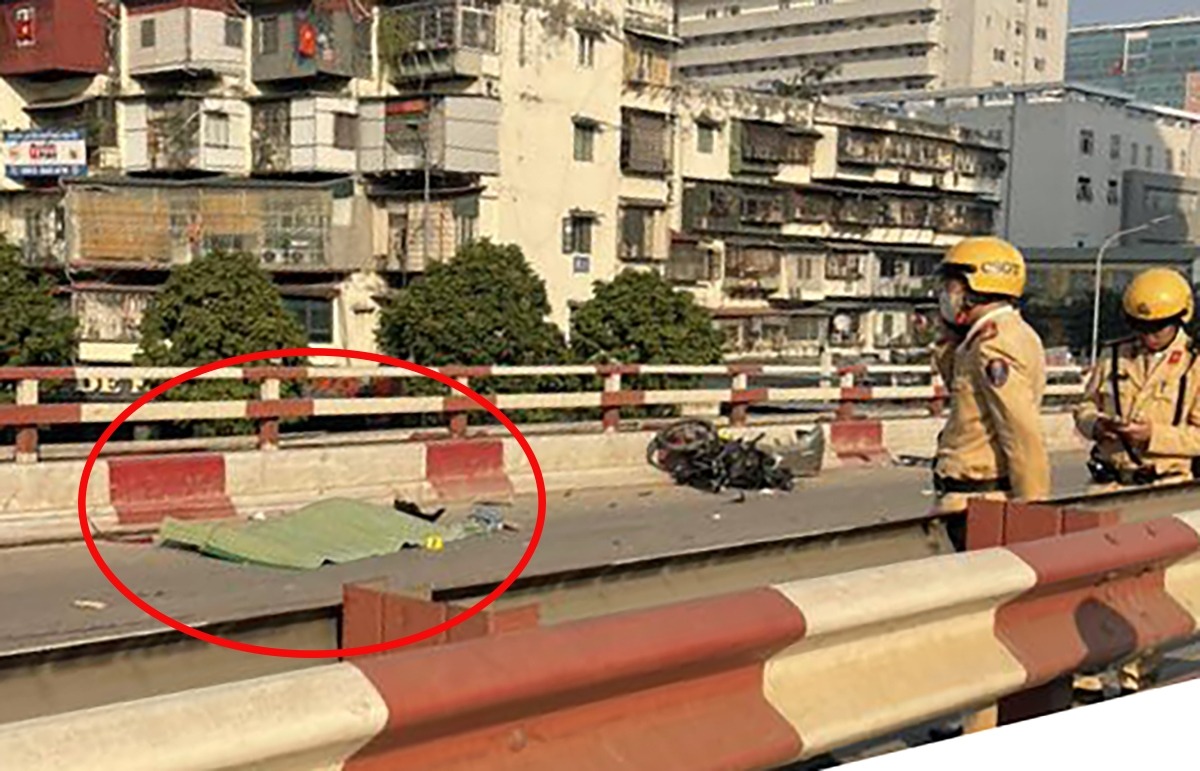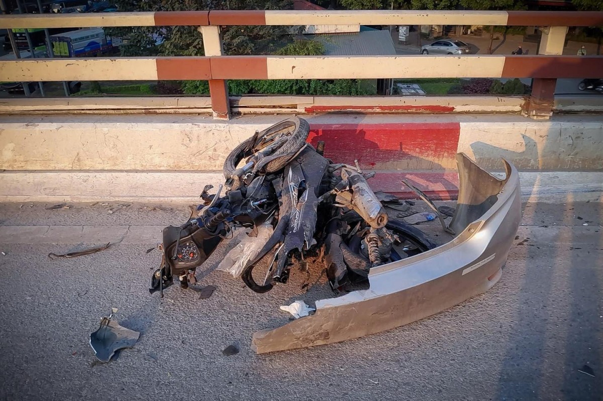 Cú va chạm khiến người đàn ông điều khiển xe máy tử vong ngay tại hiện trường. Các phương tiện đều bị hư hỏng nặng, nhiều mảnh vỡ văng khắp mặt cầu. |