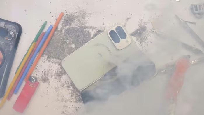 Khi Zack tiếp tục tác động lực vào phần máy đã gãy, viên pin bên trong đột ngột phồng lên, quá nhiệt và bốc khói trắng dày đặc, đủ để kích hoạt hệ thống báo cháy trong phòng. Cuối cùng, chiếc điện thoại đắt tiền chỉ còn là một khối cháy đen trên bàn thử nghiệm.