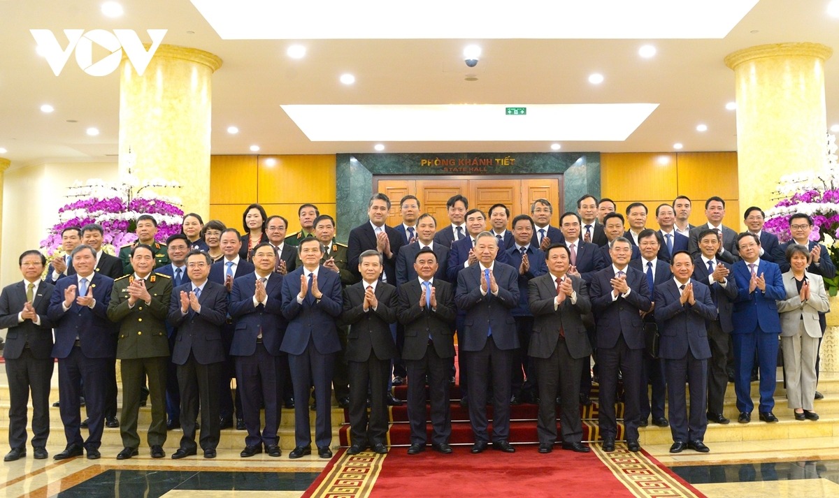 Tổng Bí thư Tô Lâm chụp ảnh lưu niệm với Hội đồng Lý luận Trung ương. |