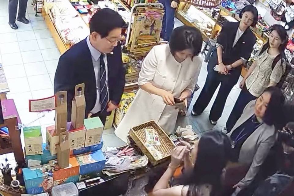 Ít giây sau, cô nhận ra đó là đoàn tùy tùng của Tổng thống Hàn Quốc và phu nhân. Hai nhân vật chính cũng nhanh chóng tiến vào với vẻ hứng thú, quan sát nhiều món đồ được bày bán trong quán và hỏi về các loại nam châm dán tủ lạnh (magnet) với nhiều hình thù dễ thương.