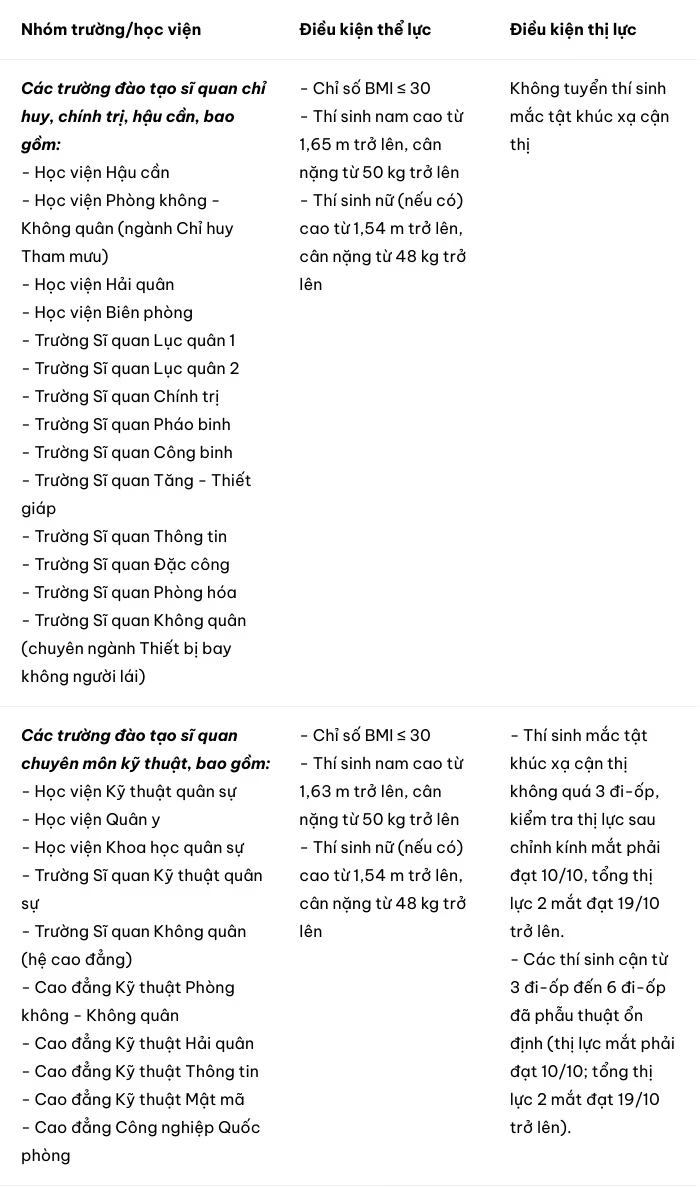 Nhóm trường đào tạo sĩ quan chỉ huy, chính trị, hậu cần không tuyển thí sinh mắc tật khúc xạ cận thị; nhóm trường đào tạo sĩ quan chuyên môn kỹ thuật tuyển thí sinh mắc tật khúc xạ cận thị không quá 3 đi-ốp hoặc đã phẫu thuật đạt tiêu chuẩn thị lực. Cụ thể như sau: