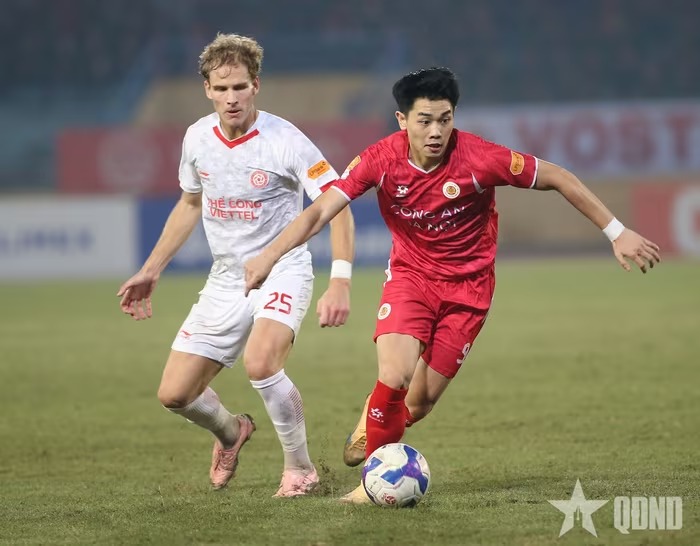 Đình Bắc (áo đỏ) trong trận Công an Hà Nội gặp Thể Công-Viettel. |