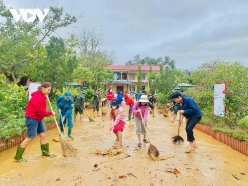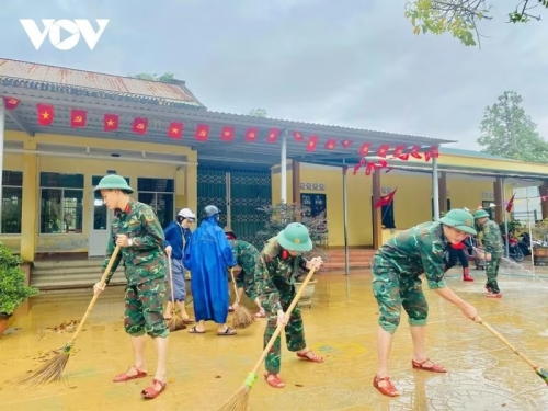 Với phương châm “nước rút đến đâu, giúp dân đến đó”, Bộ Chỉ huy Quân sự tỉnh Quảng Trị, Công an tỉnh Quảng Trị cùng các đoàn thể huy động tối đa nhân lực, phương tiện hỗ trợ người dân dọn lũ. Trong đó, ưu tiên hỗ trợ dọn dẹp các bệnh viện, trường học, gia đình chính sách và những nhà có người yếu thế, giúp sớm ổn định cuộc sống người dân. Đại tá Trịnh Thanh Bình, Chỉ huy trưởng Ban Chỉ huy Bộ đội Biên phòng tỉnh Quảng Trị đã chỉ đạo lực lượng biên phòng về cơ sở hỗ trợ tổng vệ sinh, khơi thông cống rãnh, dọn dẹp bùn đất ở nhiều khu dân cư. “Quan điểm lũ rút đến đâu khắc phục đến đó, chúng tôi tổ chức tập trung lực lượng khắc phục hậu quả, đặc biệt là các trụ sở, công sở và các trường học”.