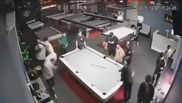 Trong clip, một thanh niên bất ngờ lao tới tấn công người còn lại. Cả hai sau đó đánh nhau ngay cạnh bàn bida. Trong lúc giằng co, một người leo lên bàn, mất thăng bằng rồi ngã xuống, nằm bất động.
