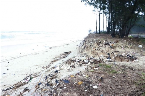 Sóng biển lớn đánh vào bờ bãi tắm Cửa Việt khiến bờ biển bị sạt lở, nhiều gốc phi lao bị trơ rễ. |
