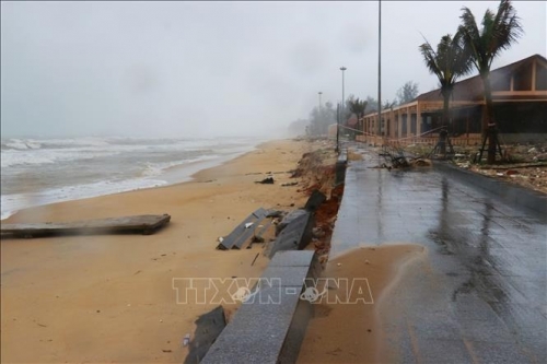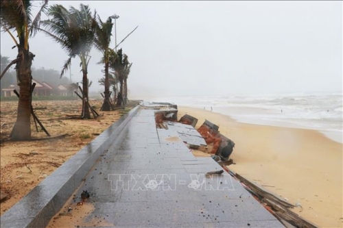 Tuy nhiên do thời tiết năm 2025 diễn biến hết sức phức tạp, dự án chịu ảnh hưởng liên tiếp của các cơn bão số 5, số 6, số 10 và số 12, dọc theo bờ biển sóng biển cao từ 4 - 6m. Toàn bộ phần cát bãi bồi trước đây, đoạn từ tường chắn đến bờ biển bị sóng đánh trôi, khoét sâu vào chân móng tường chắn dẫn đến sụt lún móng, làm trượt, đứt gãy bê tông tường chắn với chiều dài bị hư hỏng khoảng 100m.